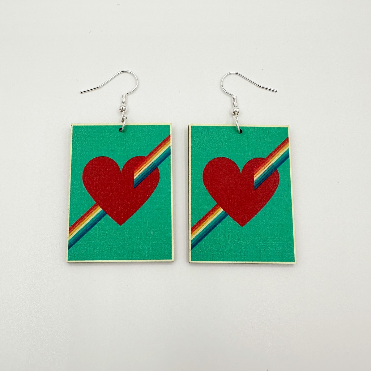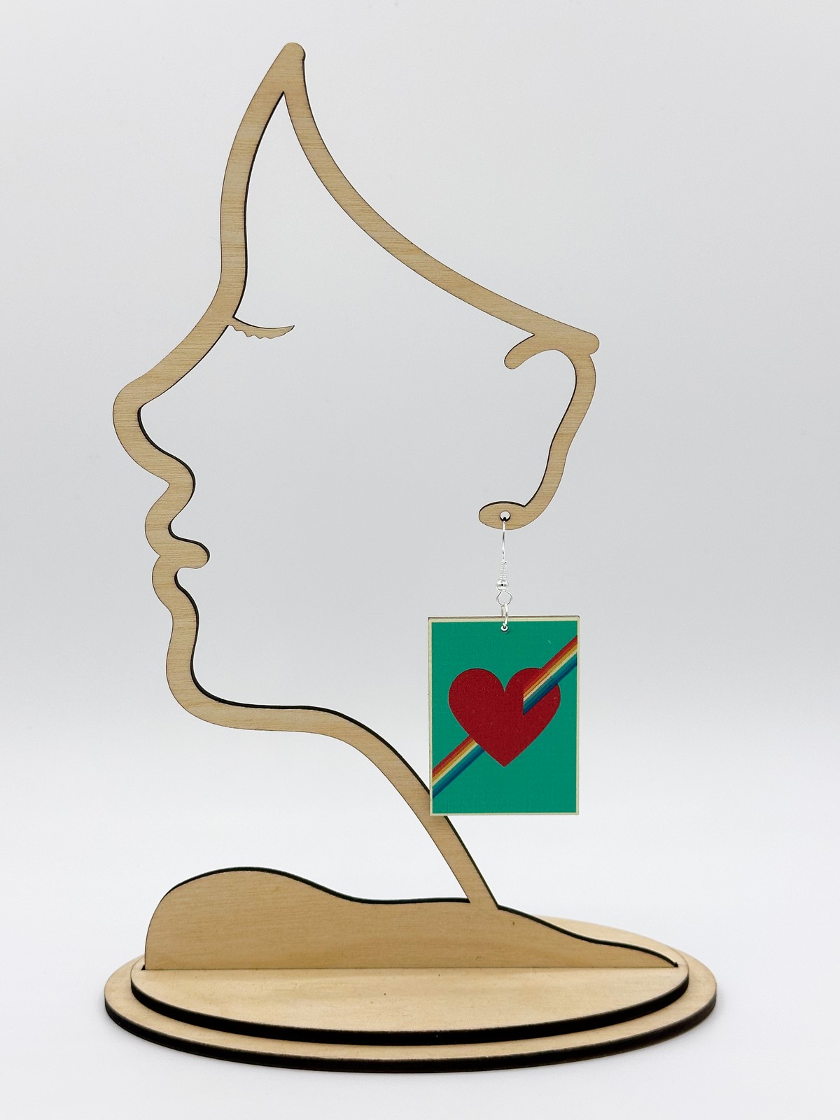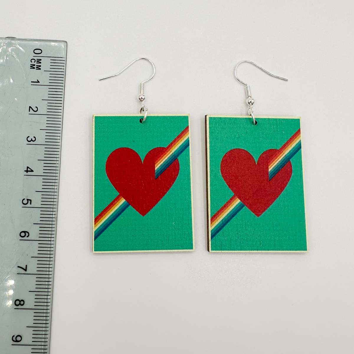 Retro sydän-taulu -korvakorut. Materiaali tulostettua vaneria.