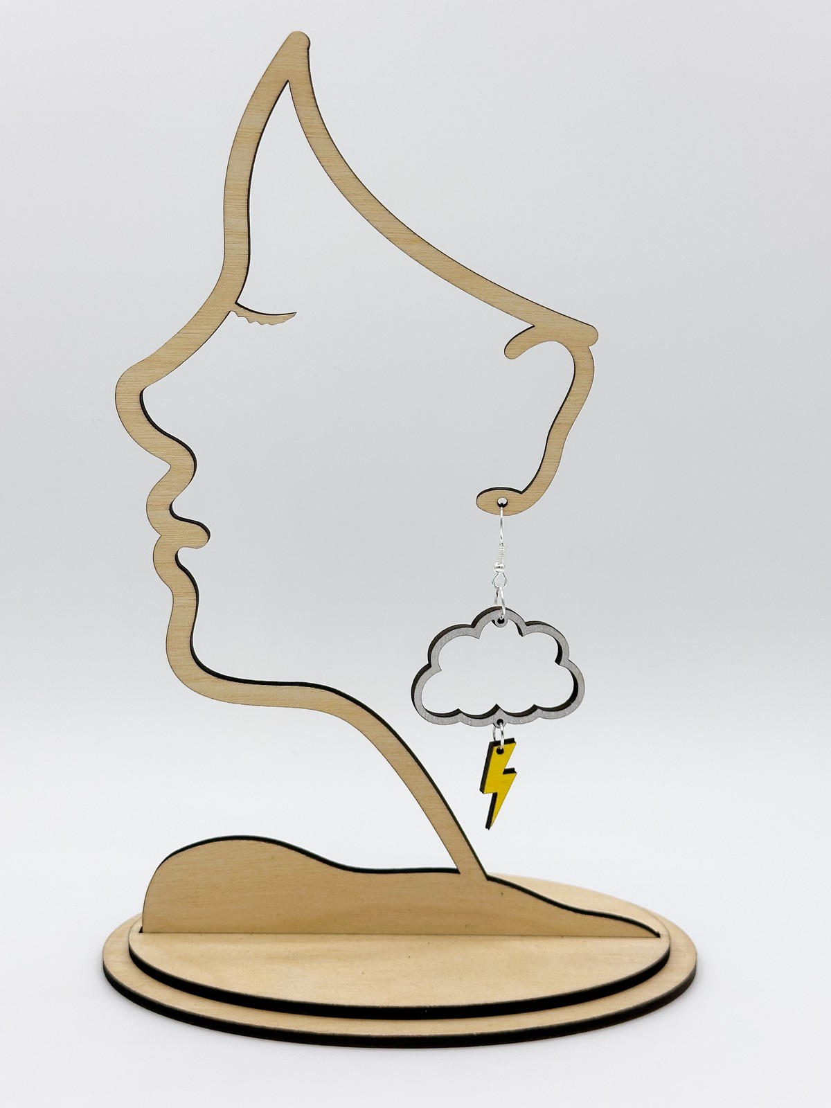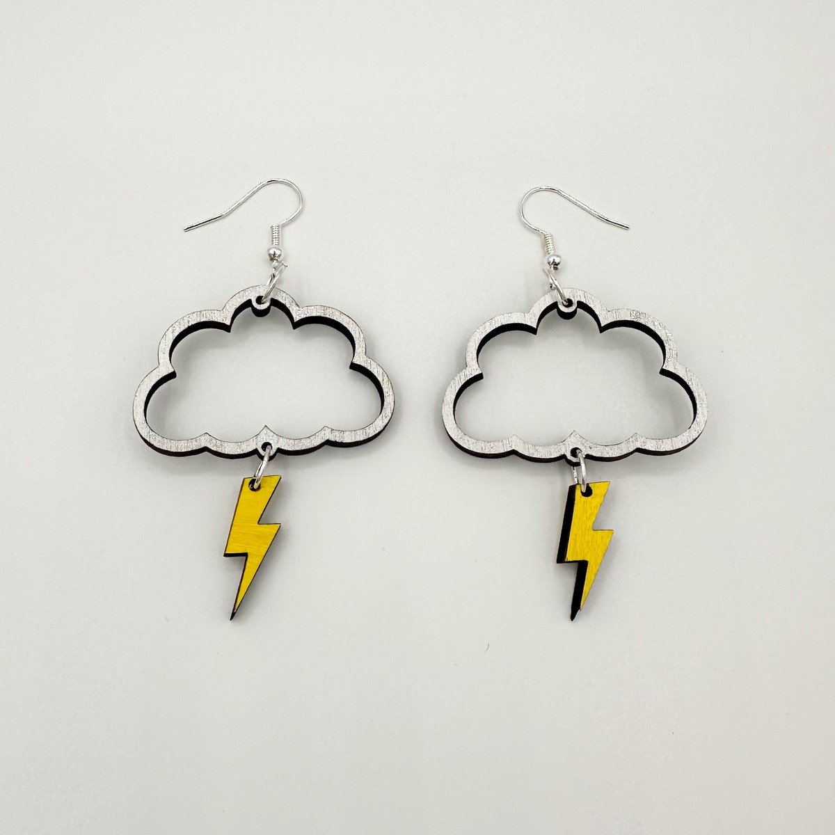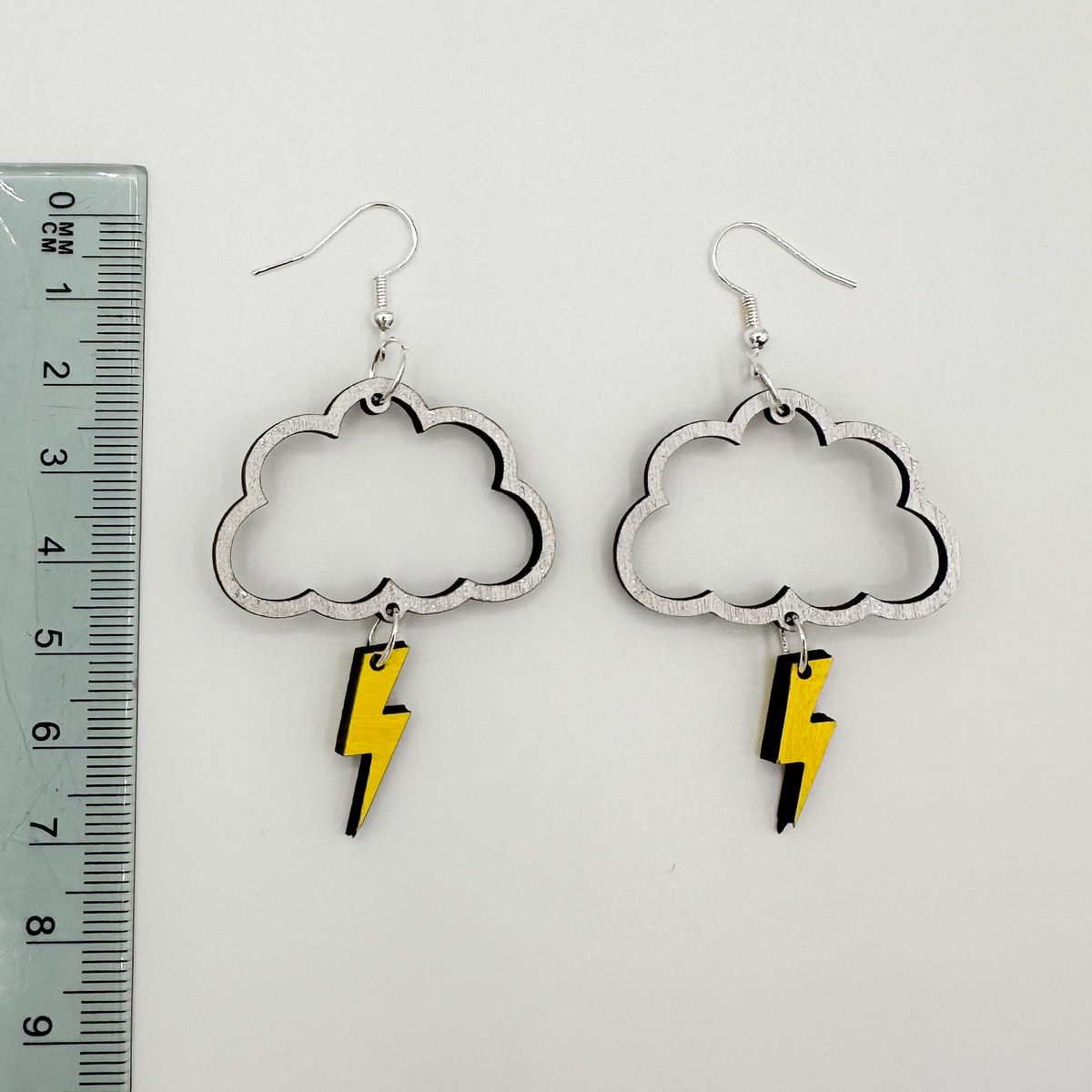 Puiset ”Salama kirkkaalta taivaalta” -korvikset. Hopea pilvenreunus ja keltainen salama.
