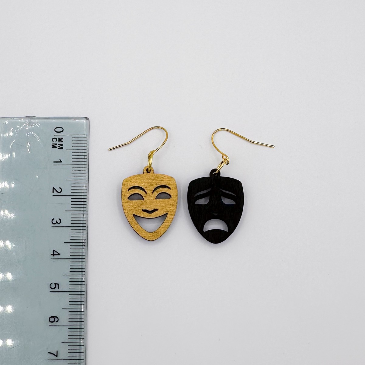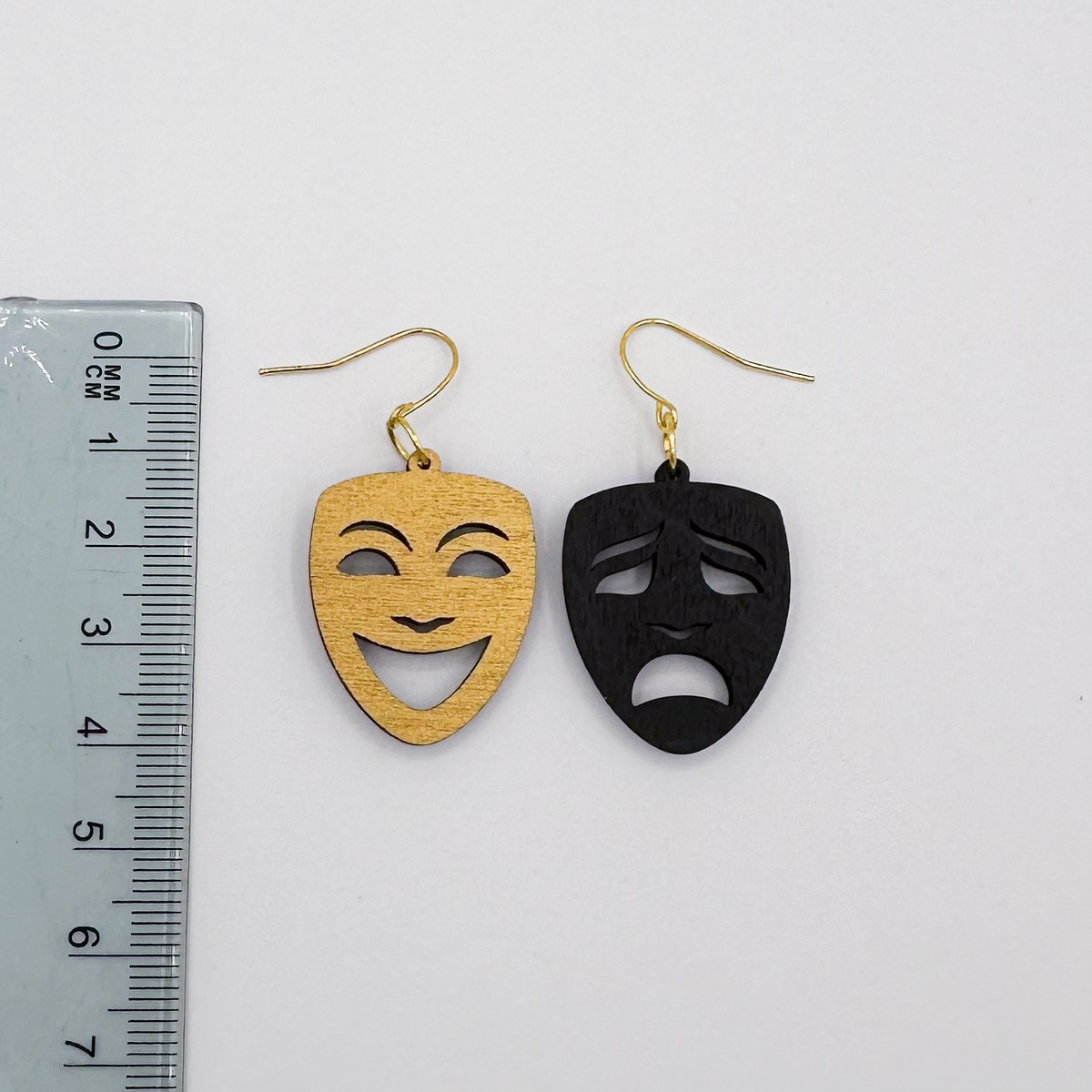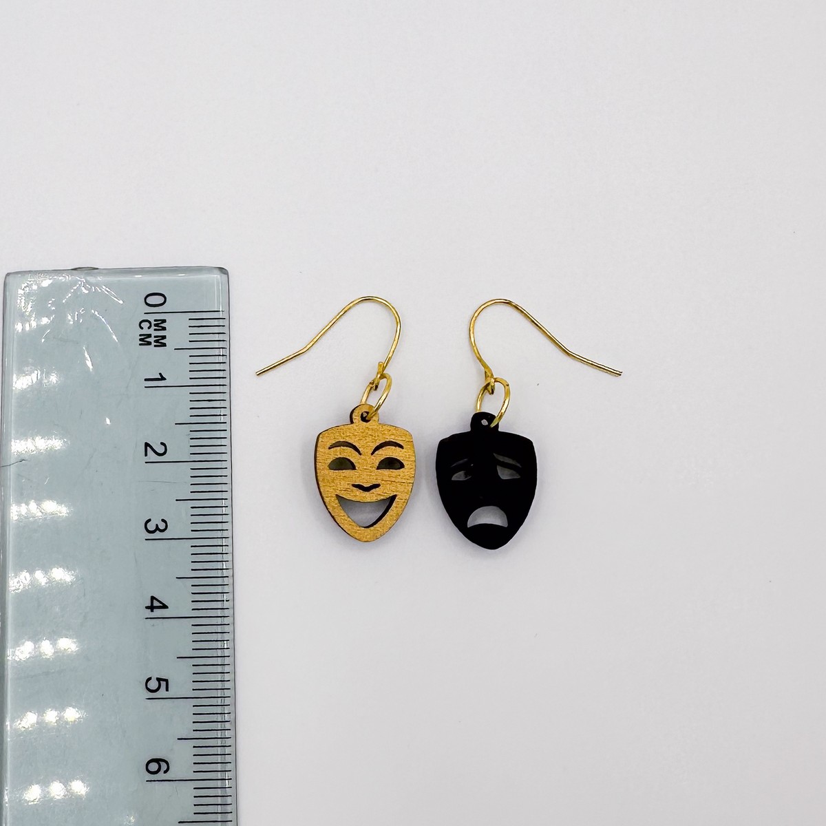 Kullanvärinen komedia-koru ja musta tragedia-koru. Saatavana useita kokoja. Koukut ruostumatonta terästä (304) aidolla 18k kultauksella.
