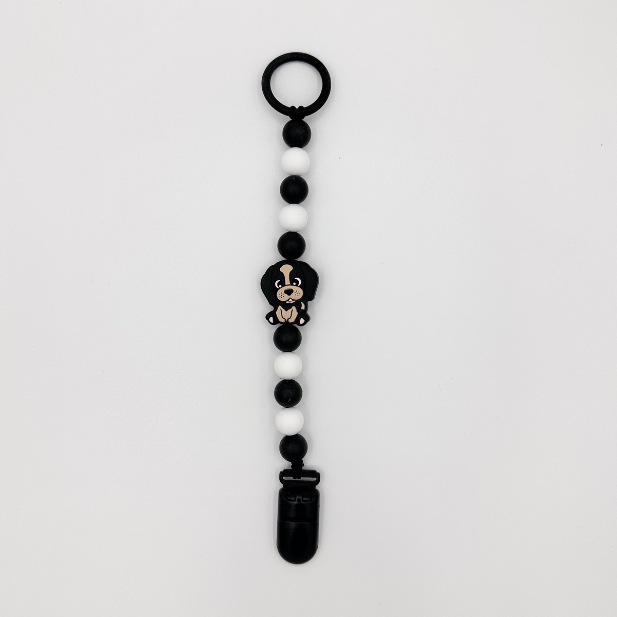 Musta-valkoinen koira-tuttinauha. Tuttinauhan pituus 18 cm. Helmien halkaisija 12 mm.
