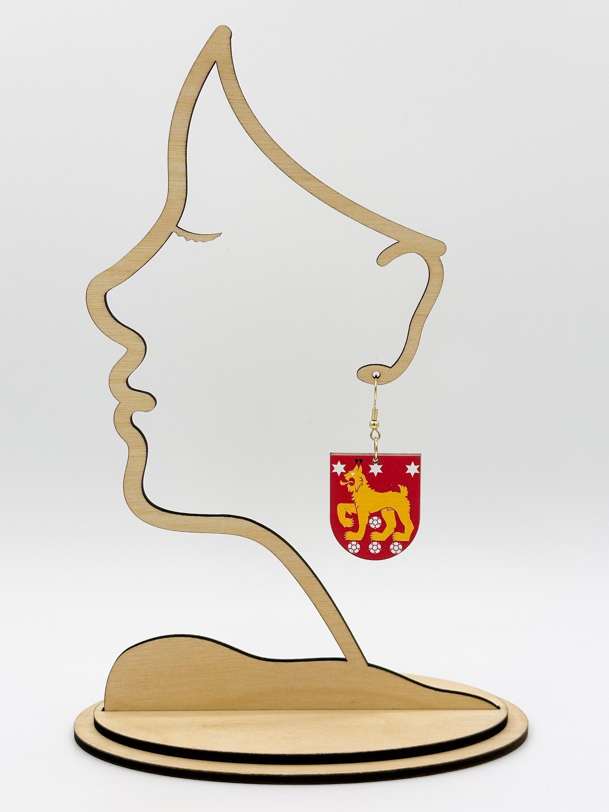 Materiaali tulostettua kotimaista koivuvaneria. Koukut ruostumatonta terästä (304) aidolla 18k kultauksella.