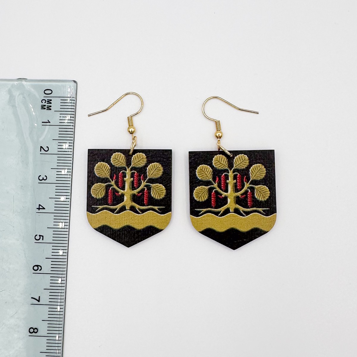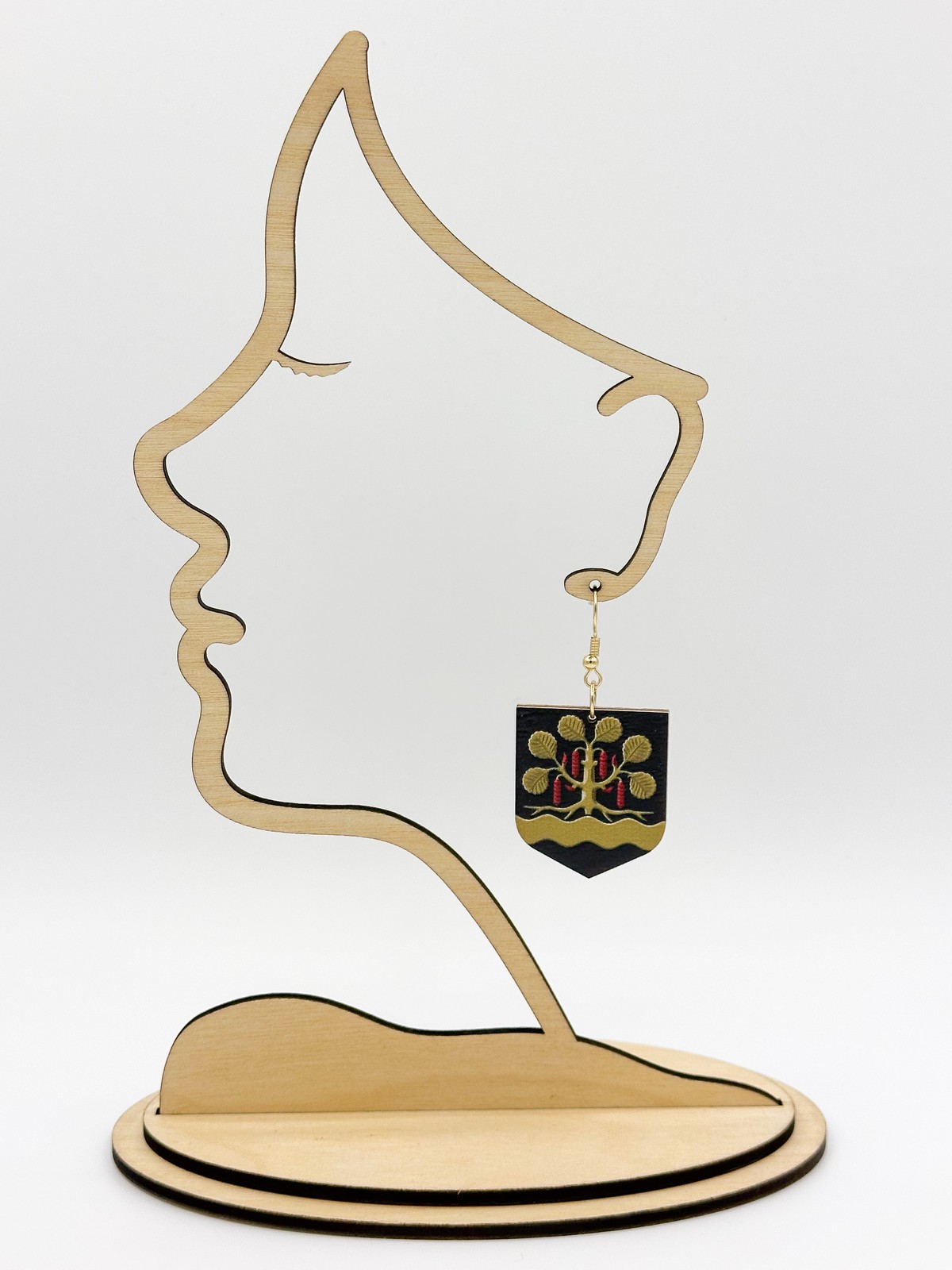 Materiaali tulostettua kotimaista koivuvaneria. Koukut ruostumatonta terästä (304) aidolla 18k kultauksella.