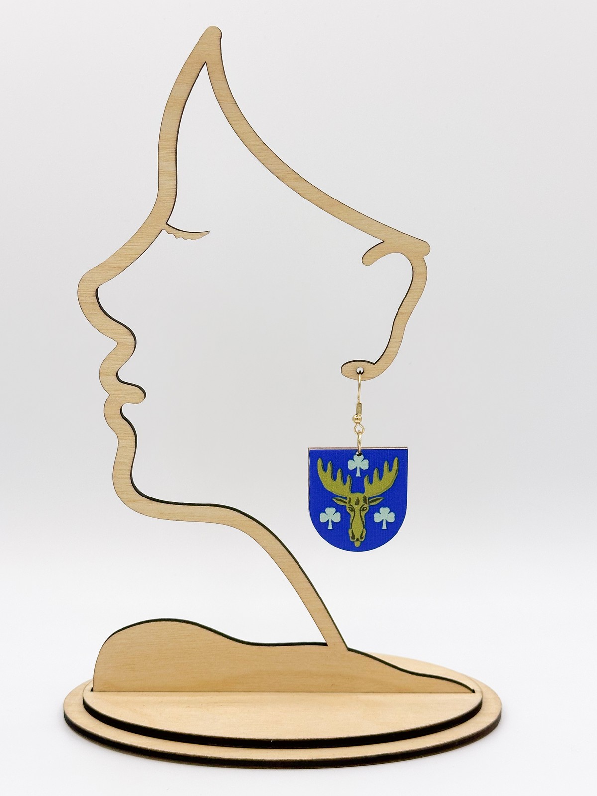 Materiaali tulostettua kotimaista koivuvaneria. Koukut ruostumatonta terästä (304) aidolla 18k kultauksella.