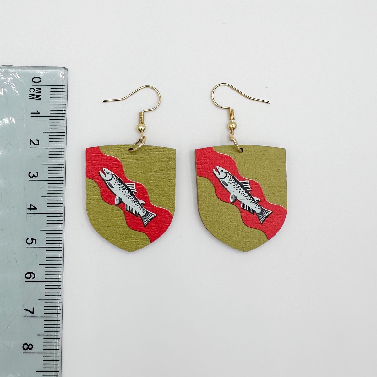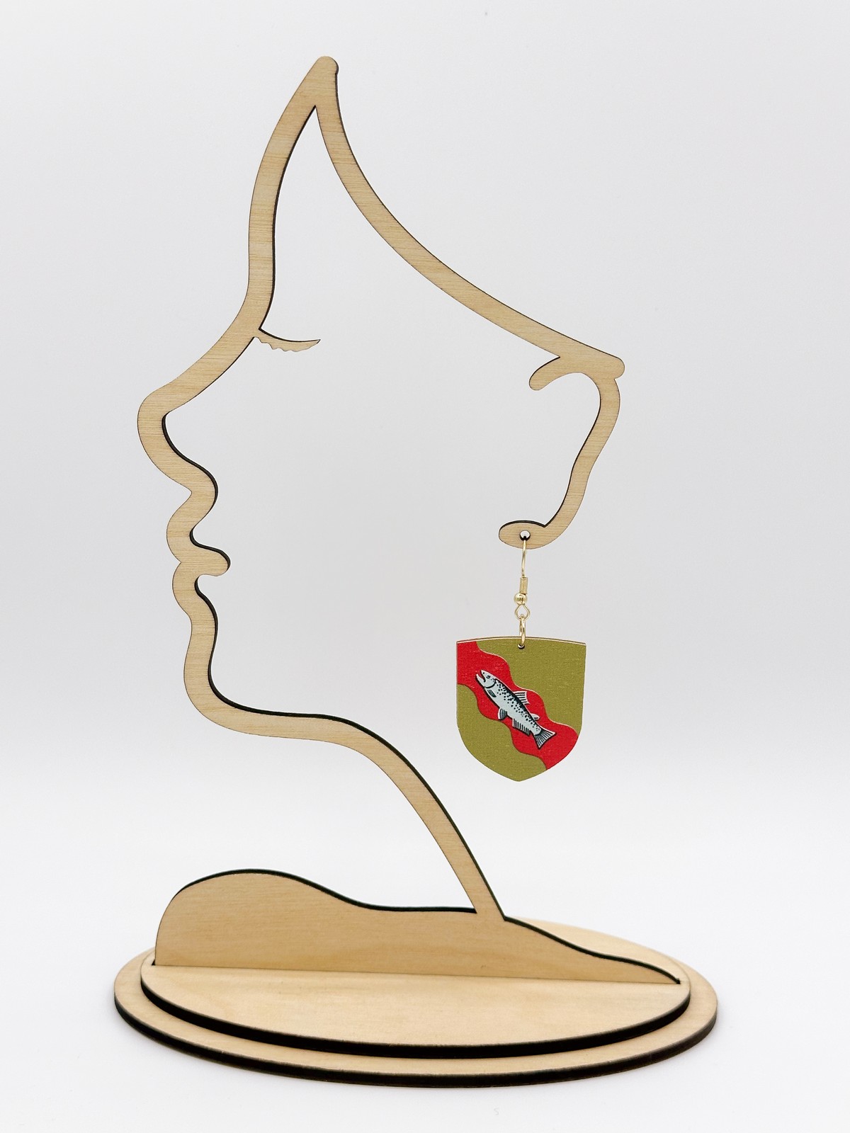 Materiaali tulostettua kotimaista koivuvaneria. Koukut ruostumatonta terästä (304) aidolla 18k kultauksella.
