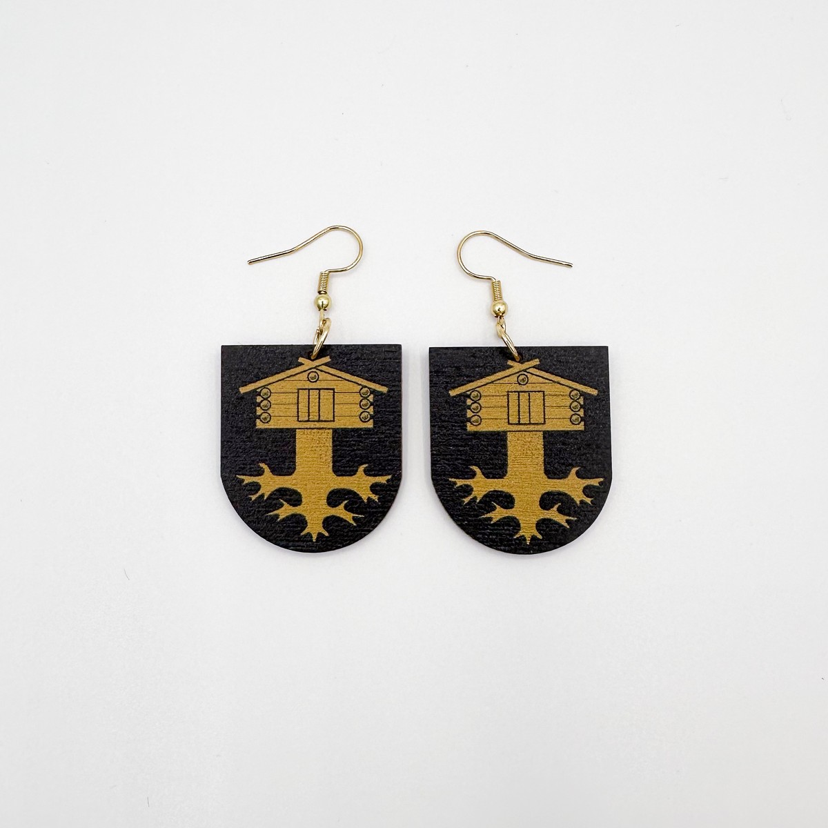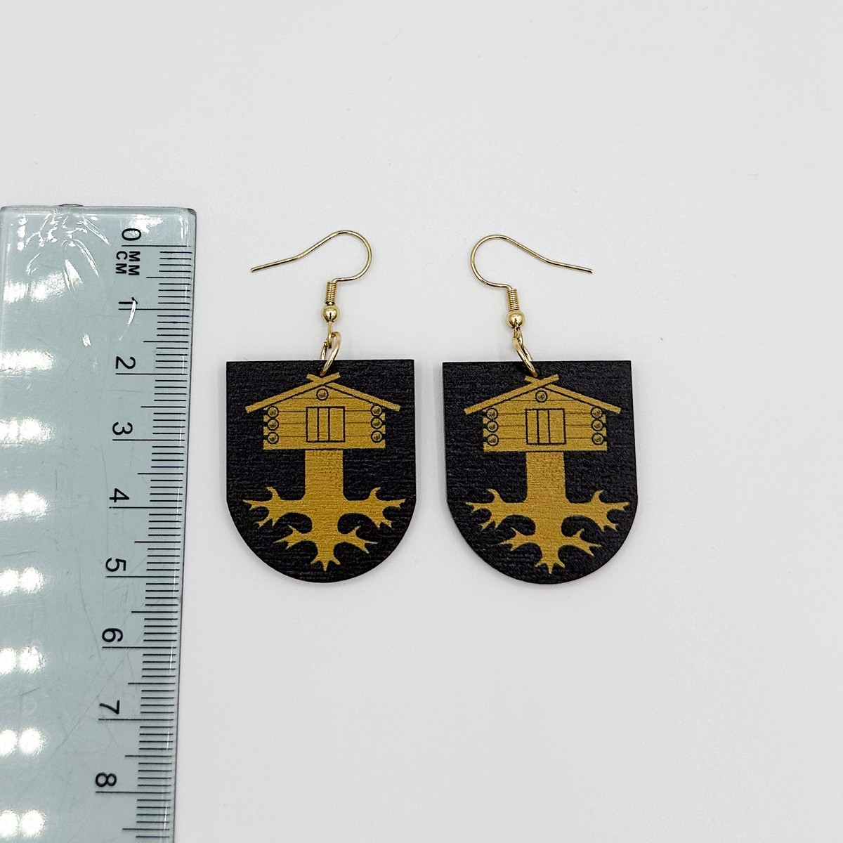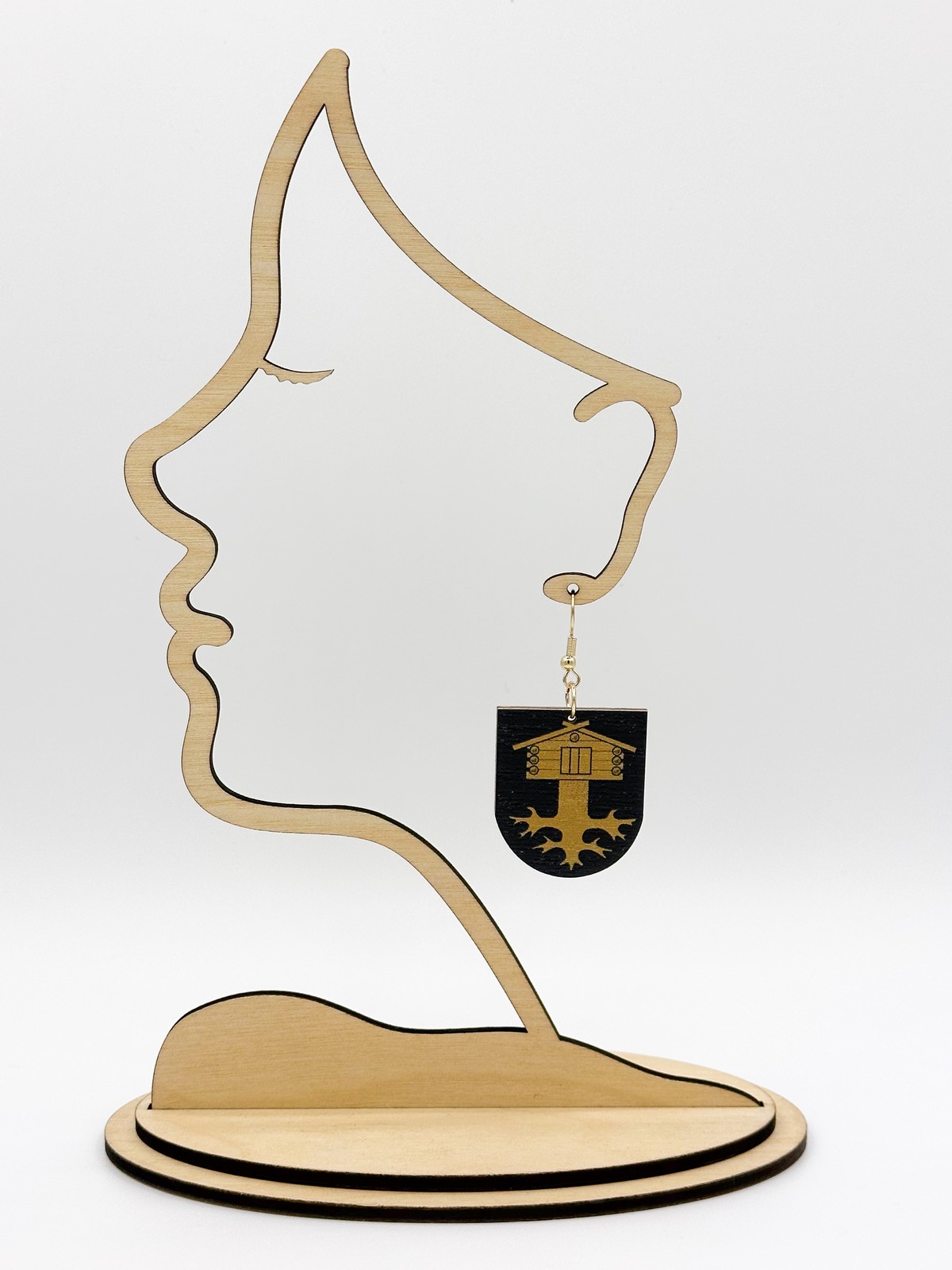 Materiaali tulostettua kotimaista koivuvaneria. Koukut ruostumatonta terästä (304) aidolla 18k kultauksella.