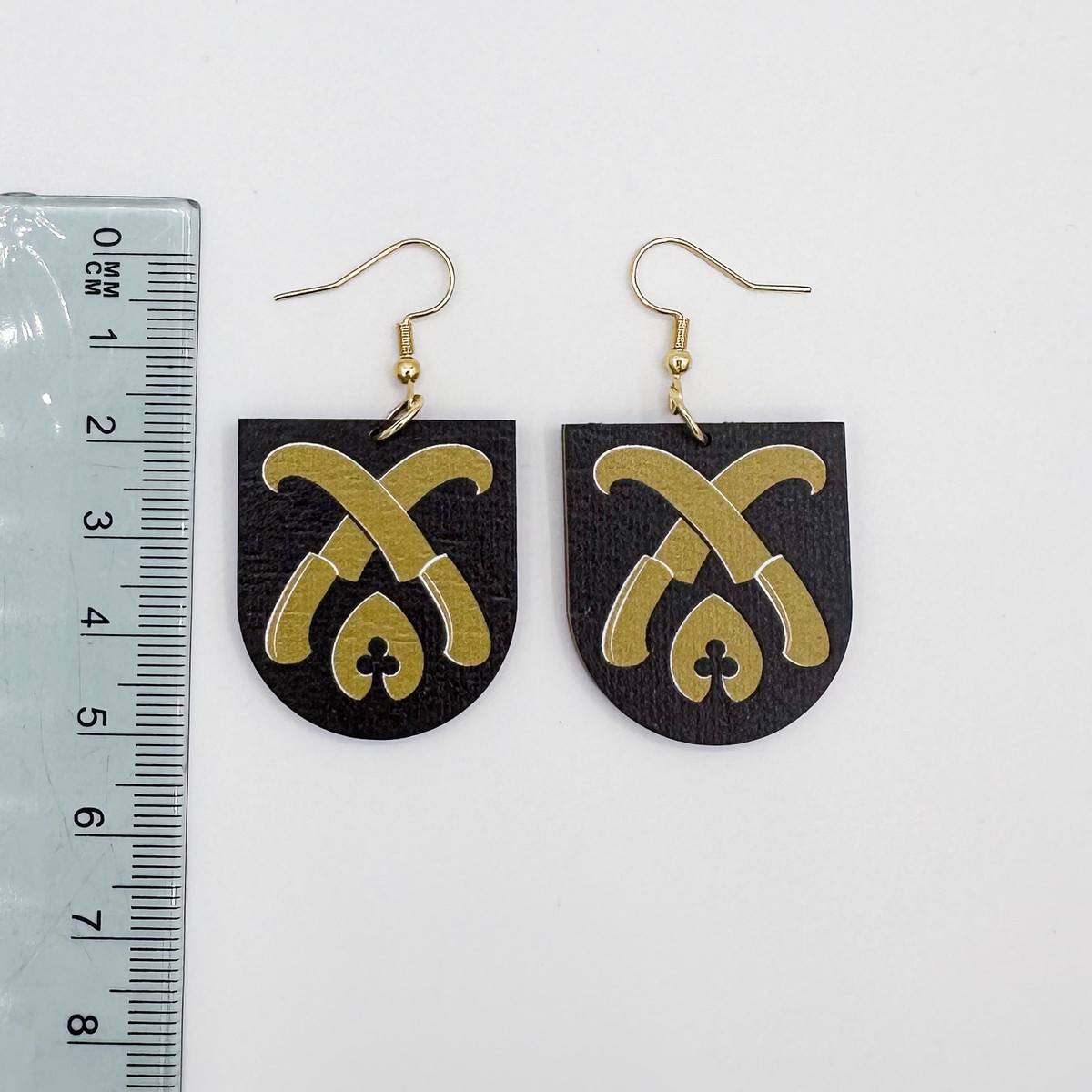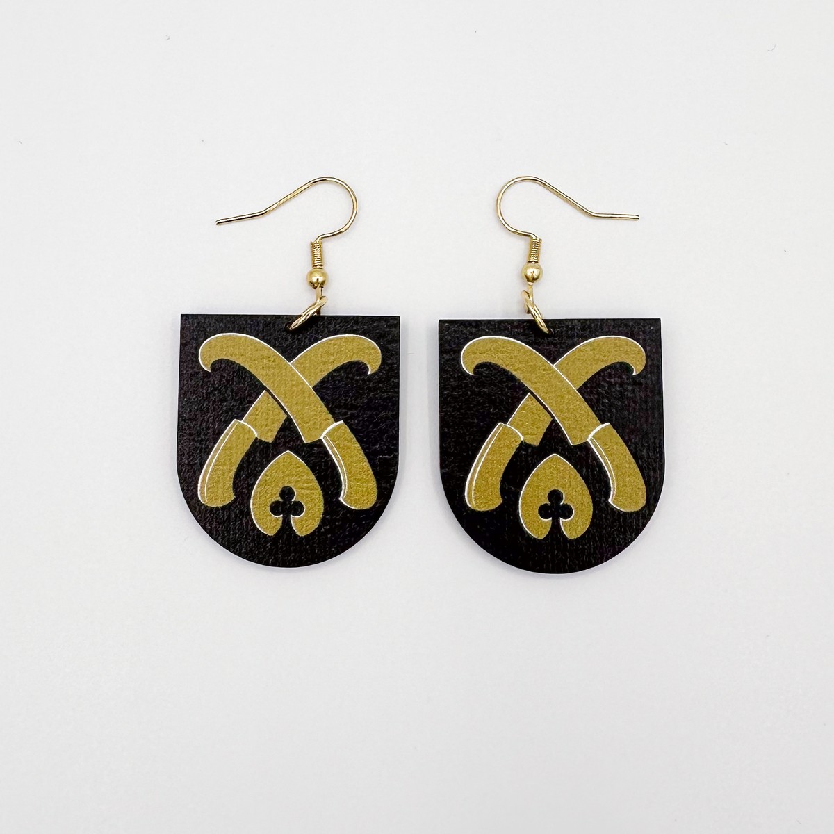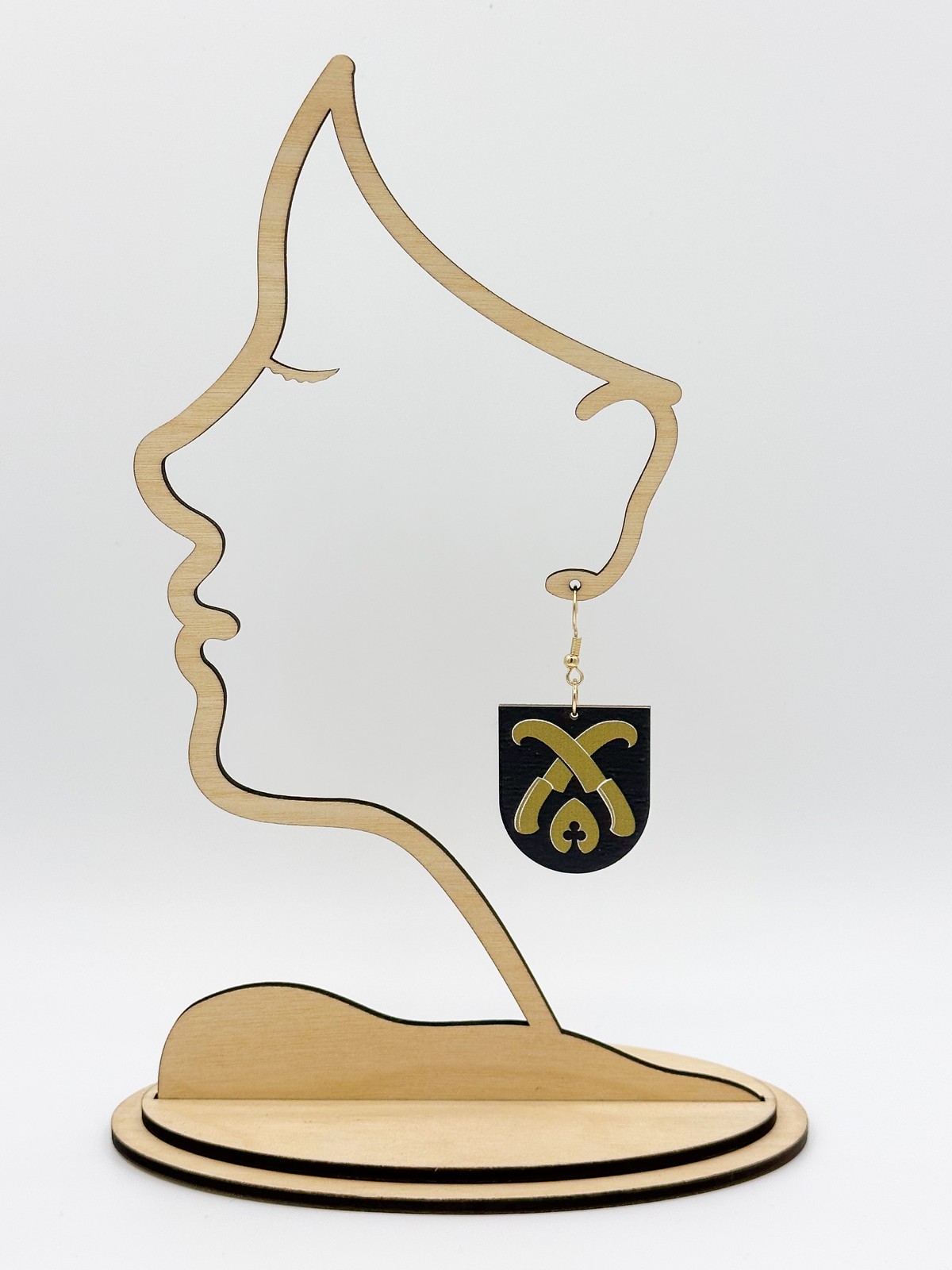 Materiaali tulostettua kotimaista koivuvaneria. Koukut ruostumatonta terästä (304) aidolla 18k kultauksella.