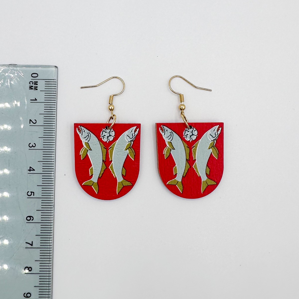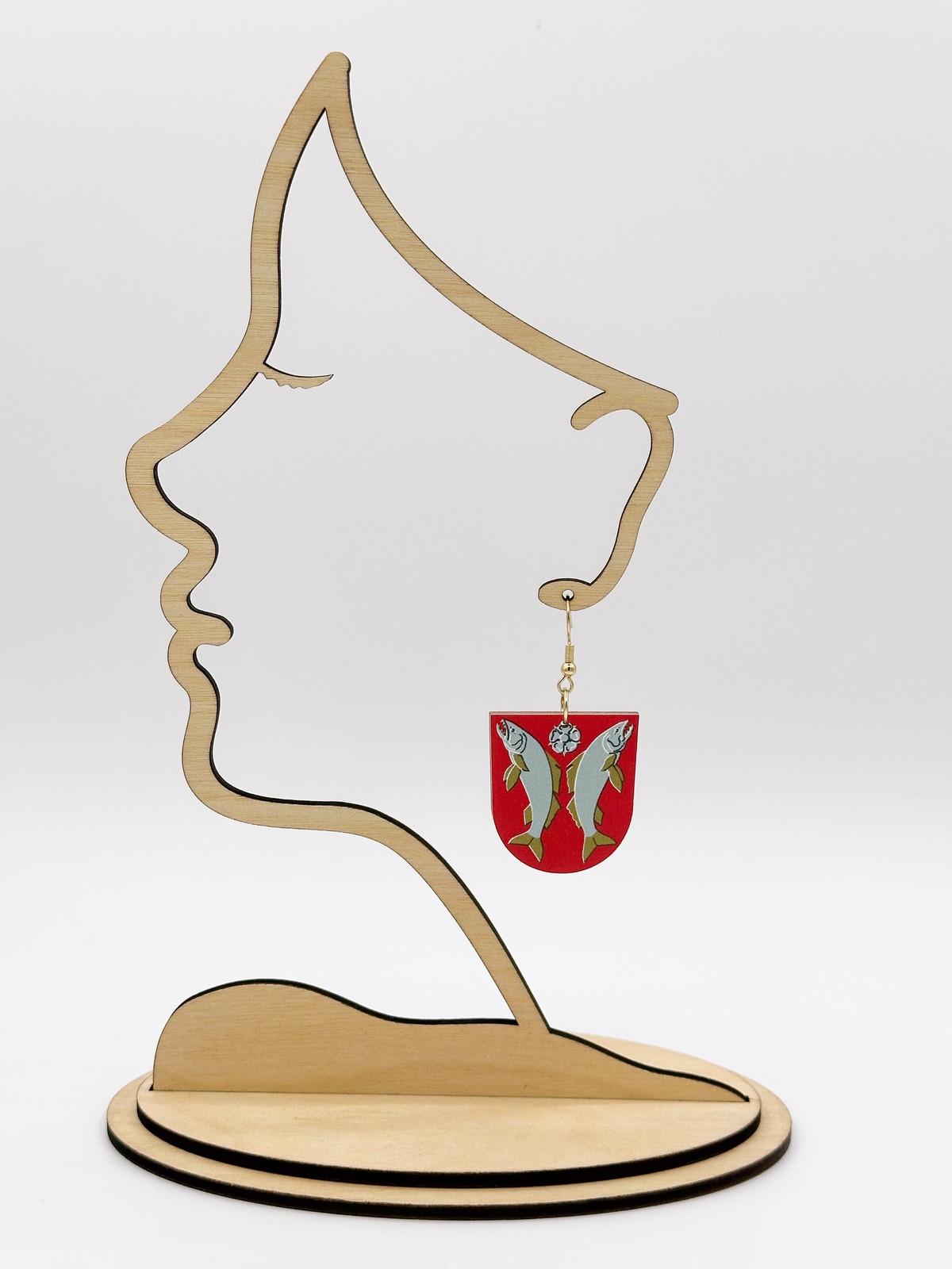 Materiaali tulostettua kotimaista koivuvaneria. Koukut ruostumatonta terästä (304) aidolla 18k kultauksella.