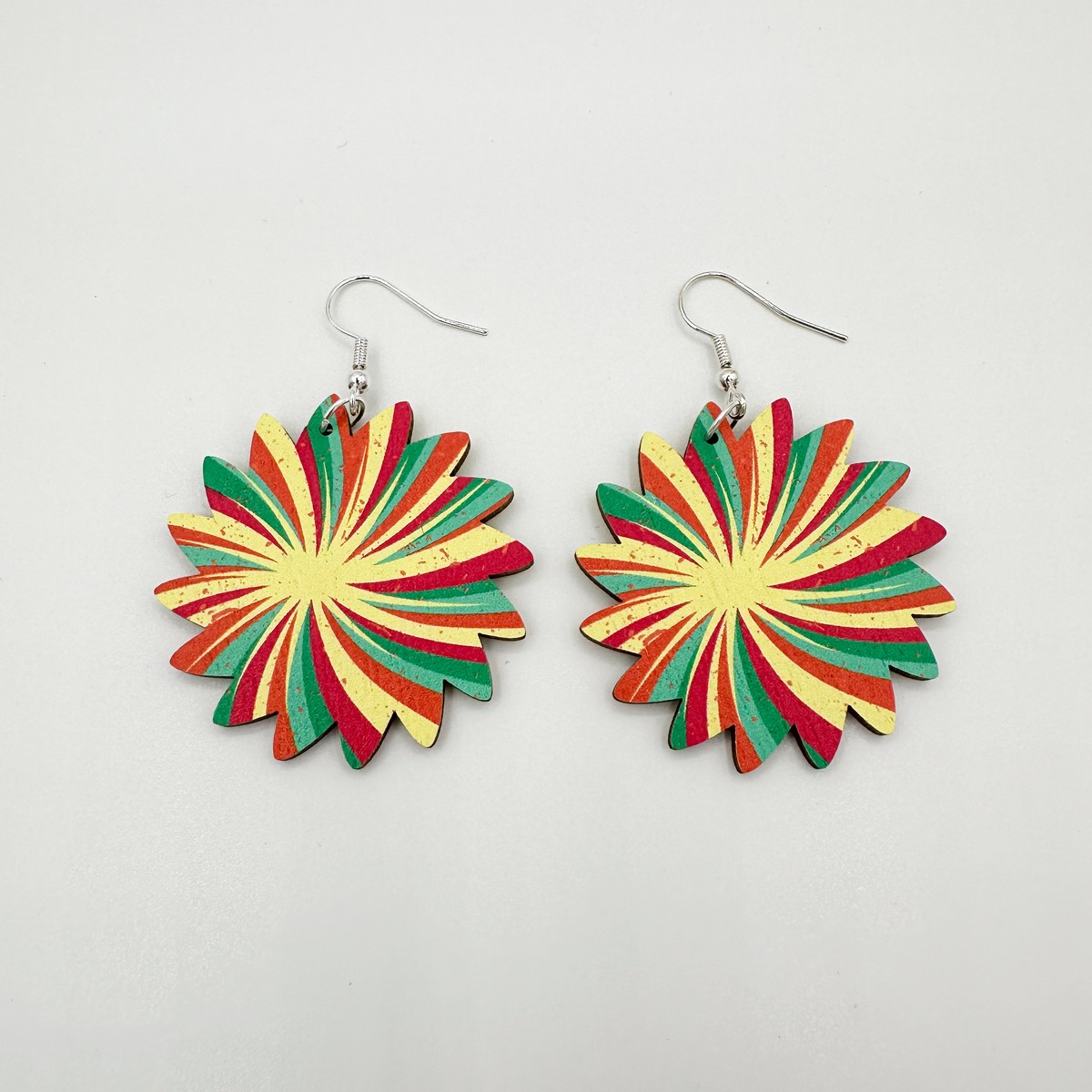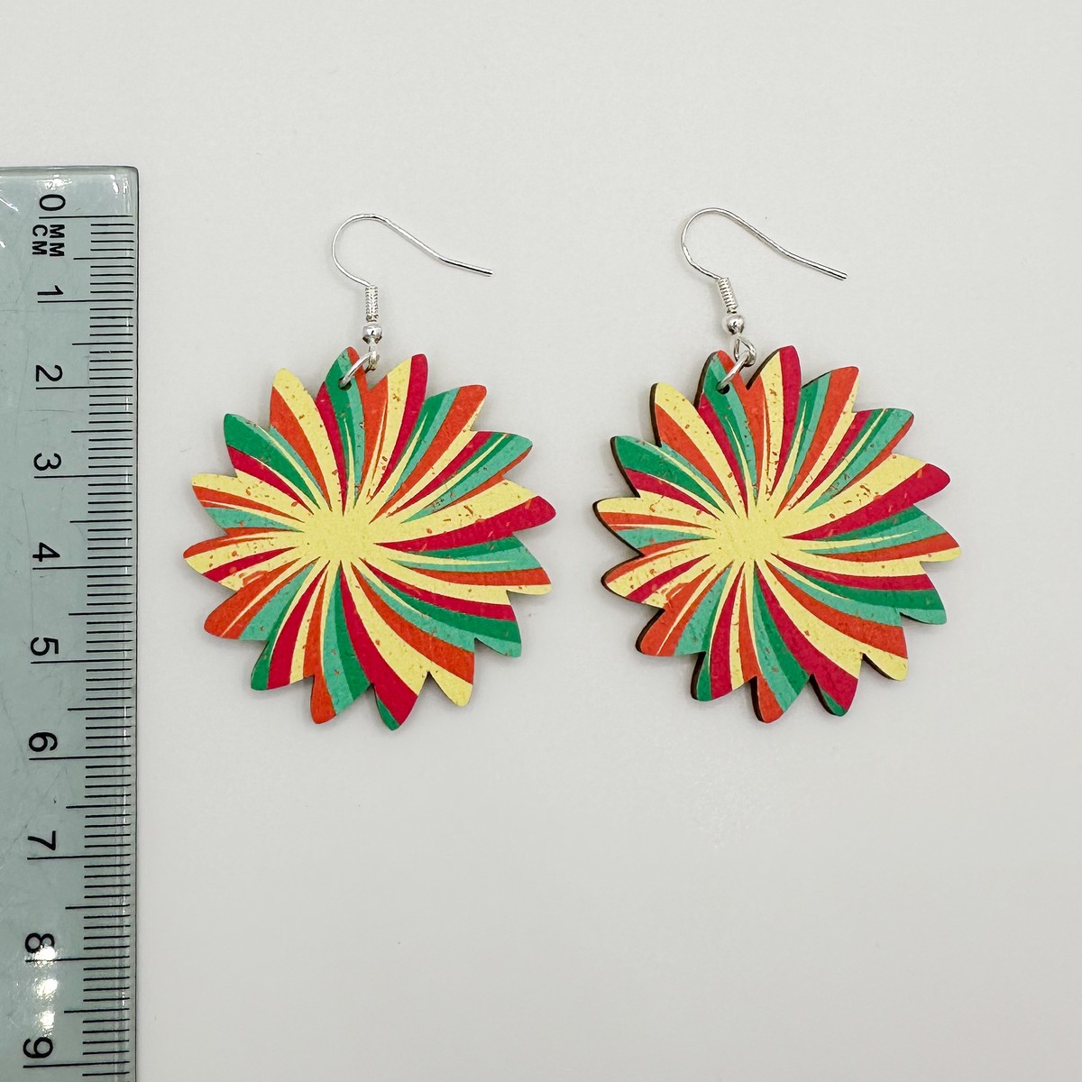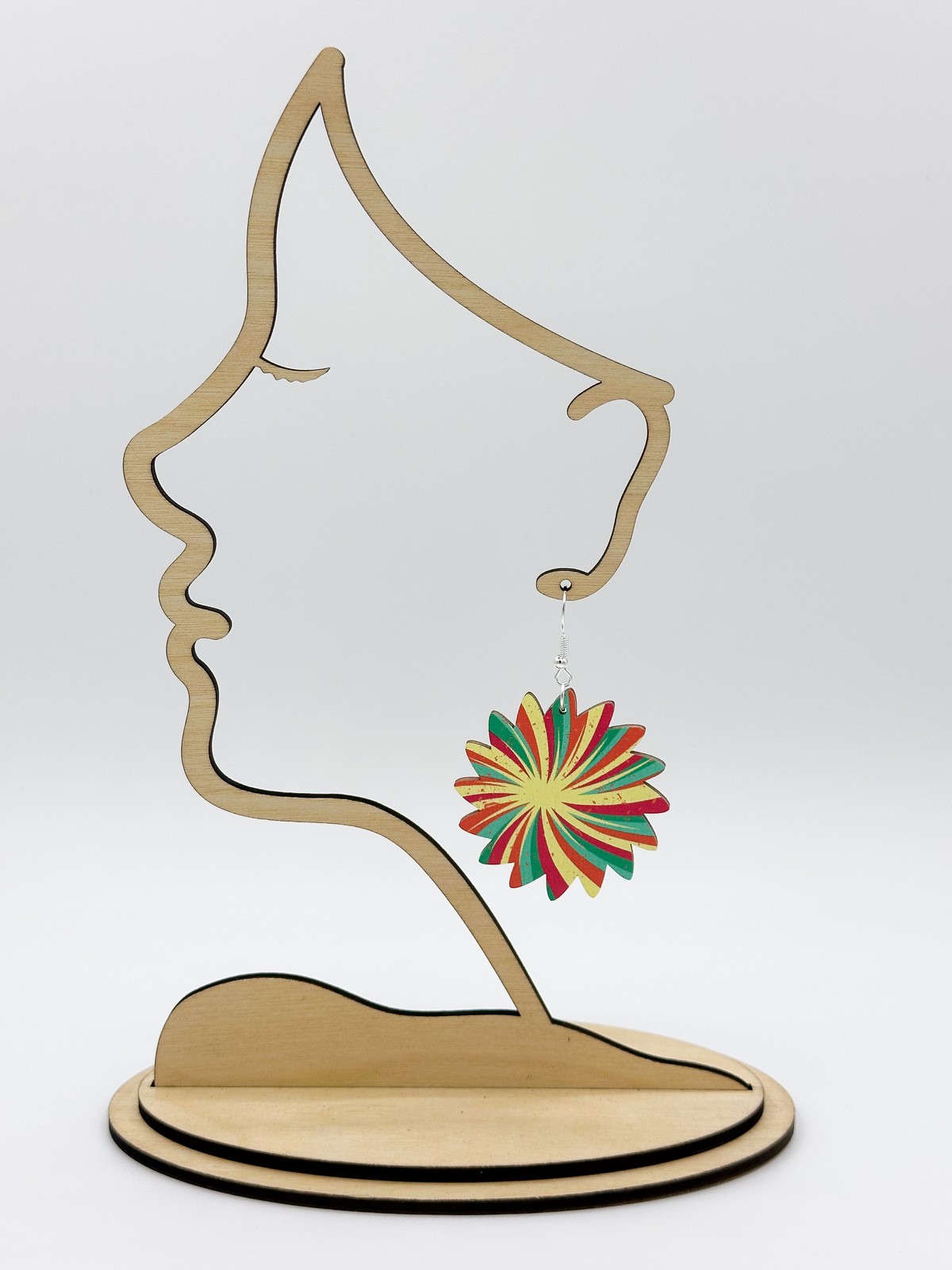 Värispiraali-korvakorut. Materiaali tulostettua vaneria.